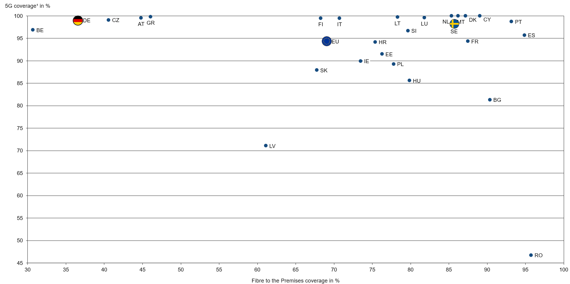 Germany aims for 100% Fibre to the Premises (FTTP) coverage by 2030, with 50% of households connected by 2025. By 2024, however, only 36.8% were covered – well below the EU average of 69.2% (Table 1). In contrast, 5G now reaches 99.1% of the population.