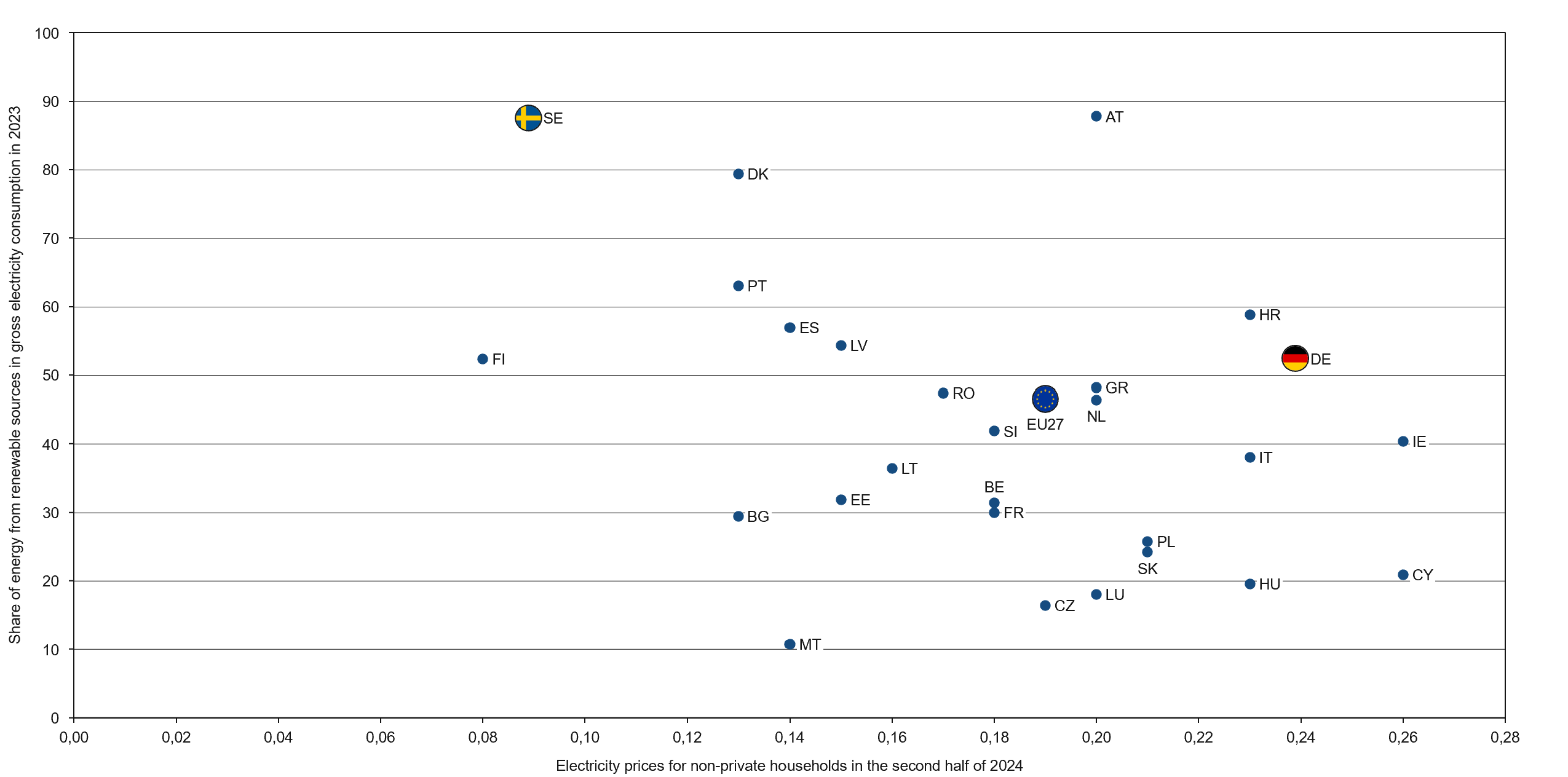 Figure 1: Comparison of electricity prices for non-private households in the second half of 2024 and the share of energy from renewable sources in gross electricity consumption in 2023 (no EU data for 2024 yet) across the EU27¹ countries