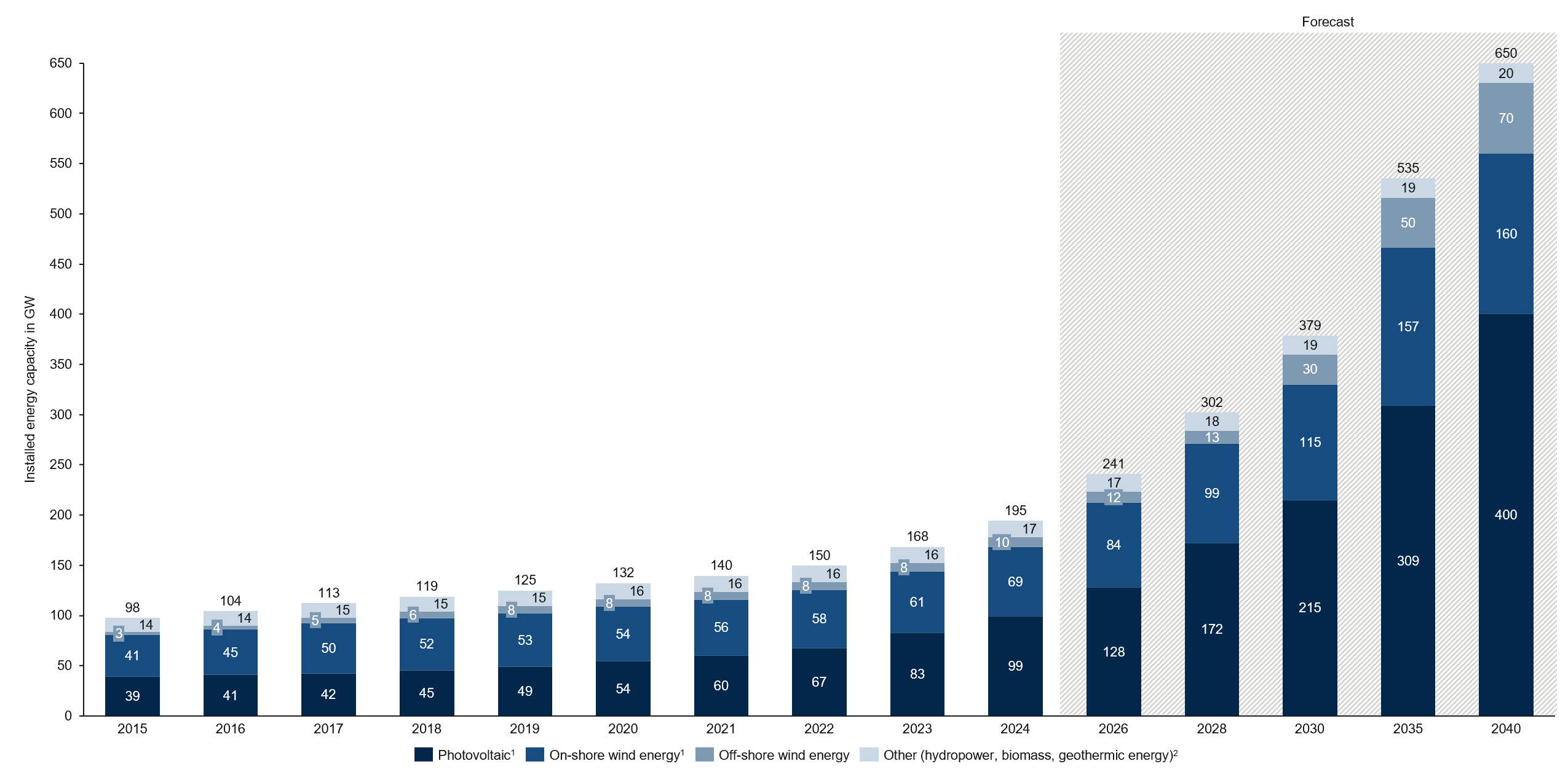 Figure 2: Capacity of renewable energies in Germany from 2015 to 2040, by type (in GW)