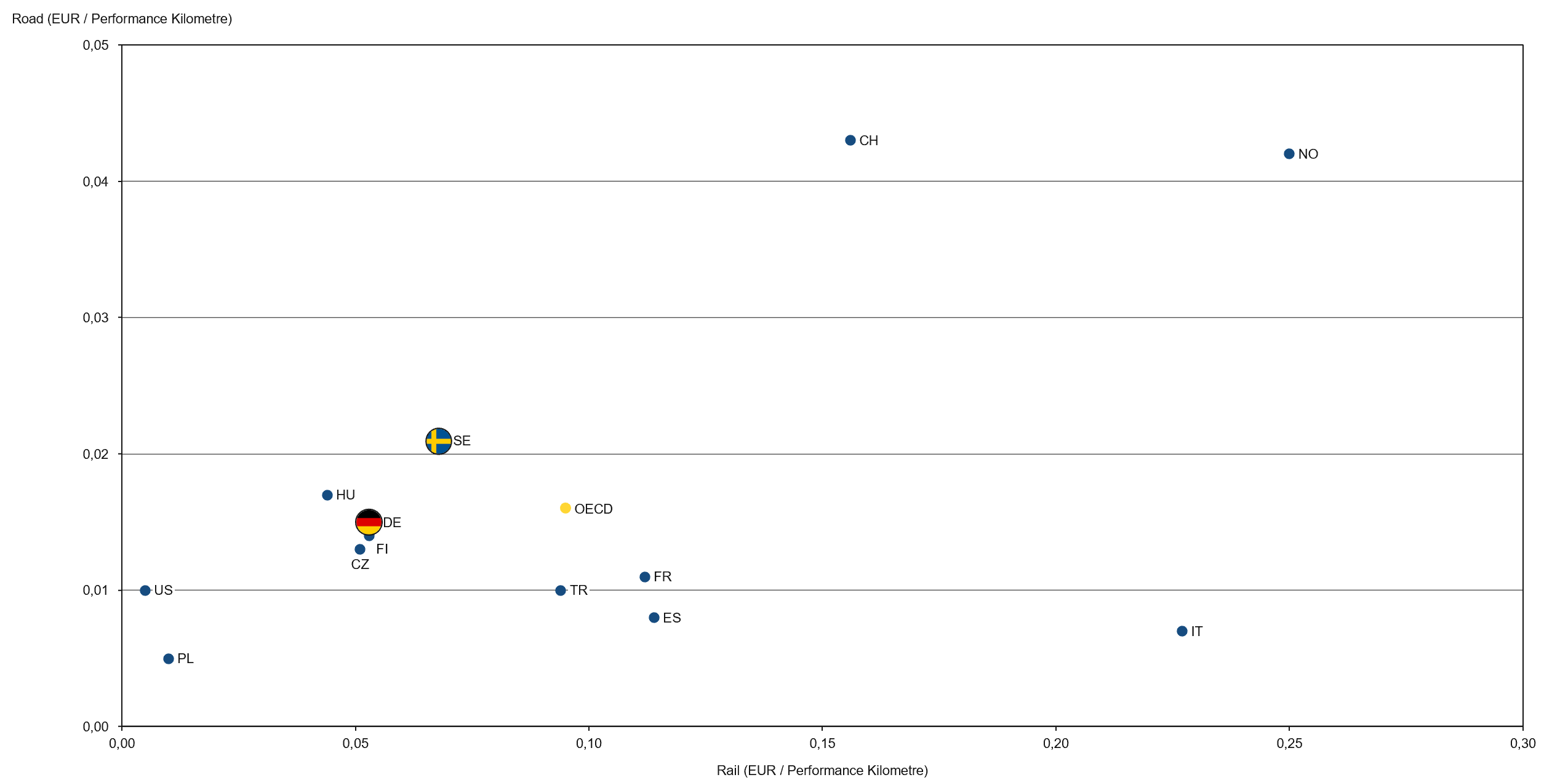 In international comparison, Germany sits mid-table among OECD countries (Figure 3). In 2020, public spending per kilometre of transport performance was about 1.5 cents for road and 5 cents for rail, which is well below levels in Norway, Switzerland and Sweden.