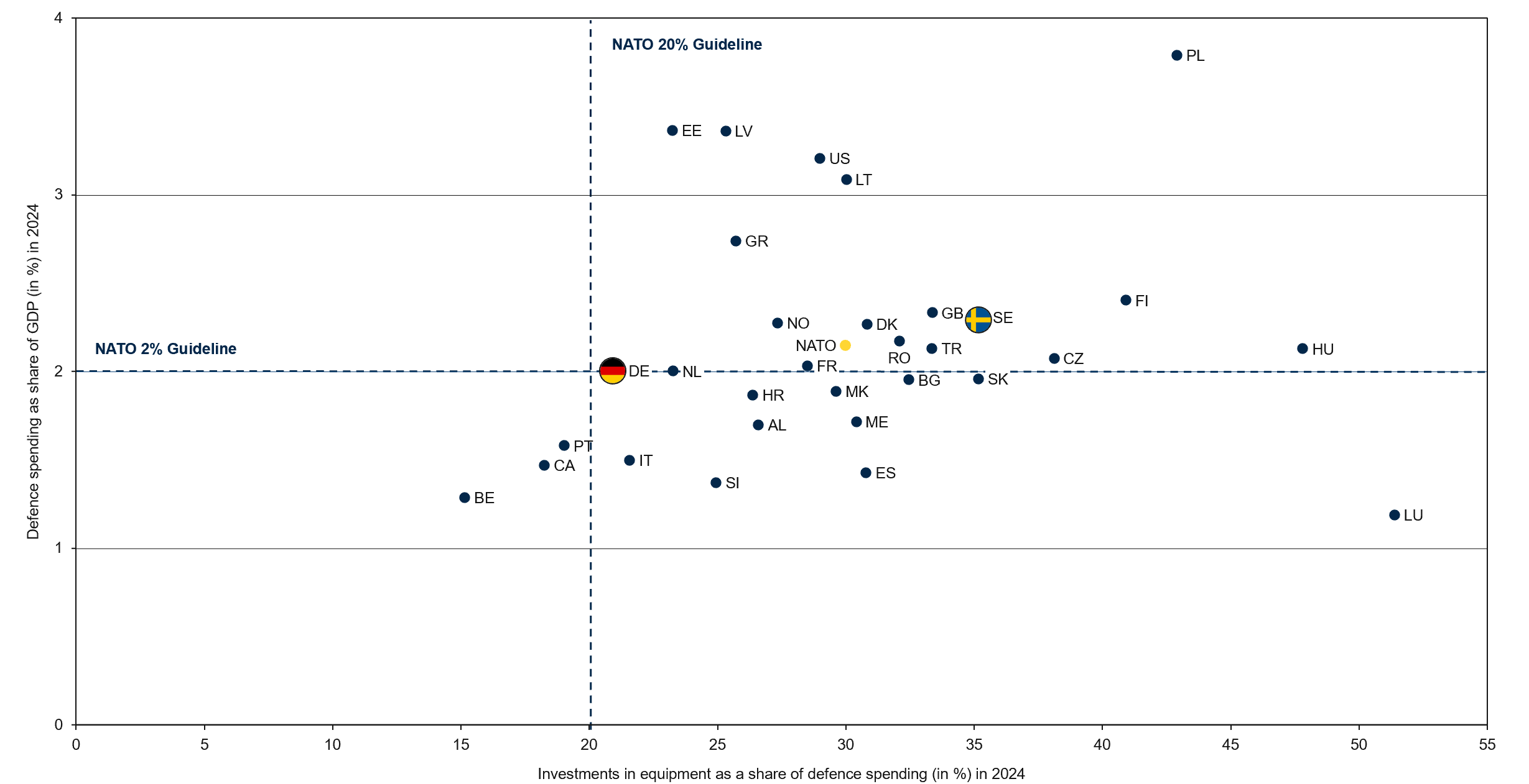 Figure 2: Defence spending1 as a share of GDP vs. equipment investments, as a share of total defence spending of NATO members2 in 2024