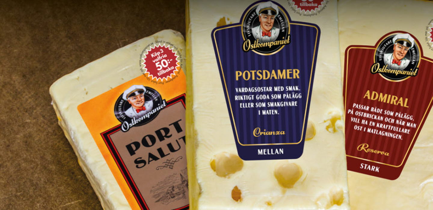 Ostkompaniet has a wide selection of Swedish quality cheese, with varying shelf life and flavor strength, which is processed under the supervision of our experienced Cheesemaster (Ostmästare). We can also offer a wide range of foreign hard cheeses and dessert cheeses from all over Europe.
