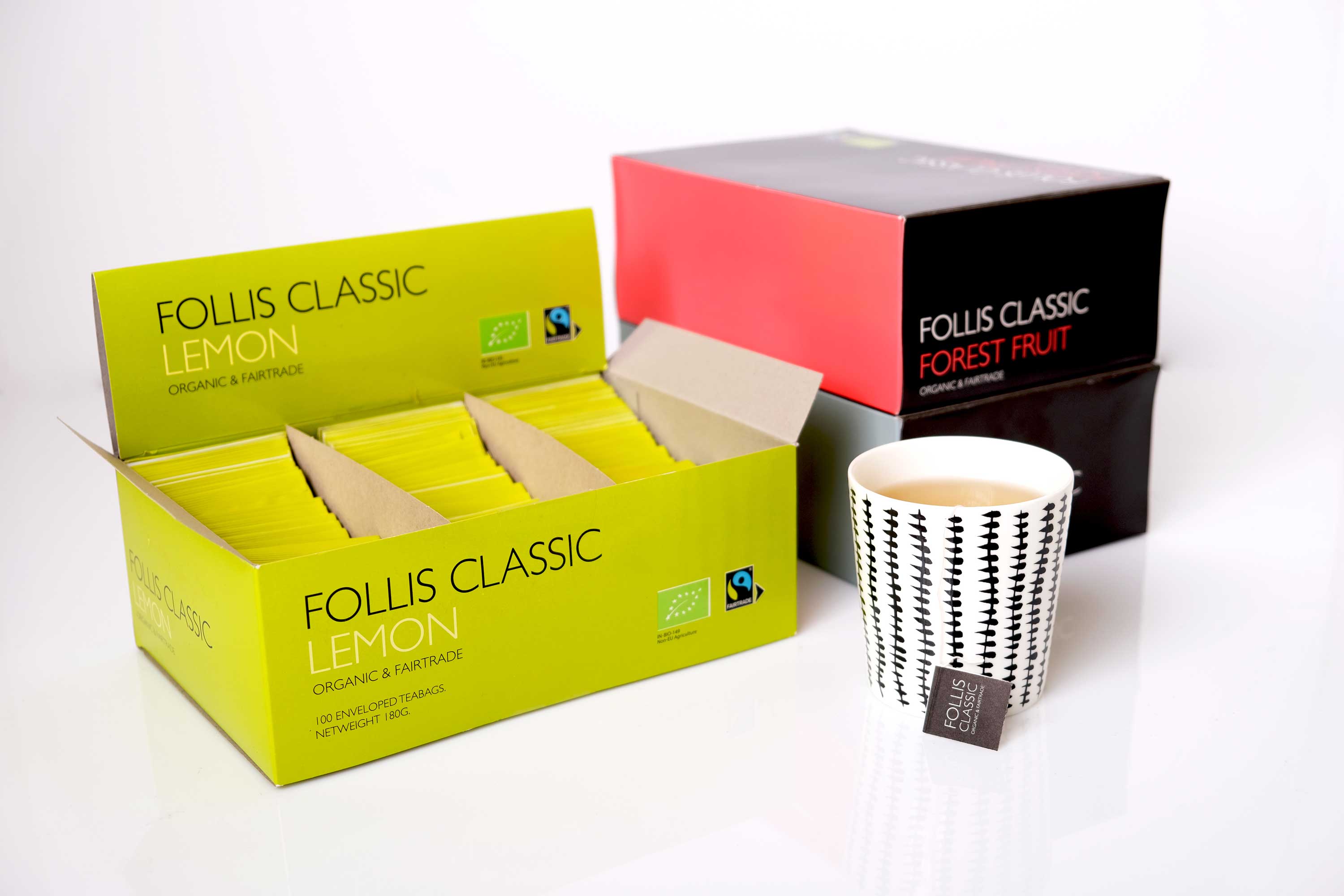 Follis Classic is double certified, really good classic teas. It is both organic and Fairtrade-certified in eight good flavours that suit most tea drinkers. It is a mix of black and green teas, flavored and unflavored but also caffeine-free Rooibos. The teas are enveloped, which both protects the tea, (tea is destroyed by light, easily absorbs other fragrances, and attracts moisture) and keeps the serving fresh and hygienic.